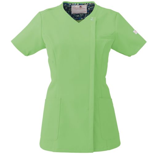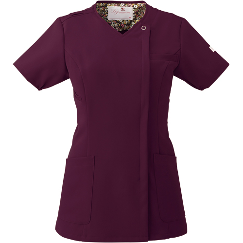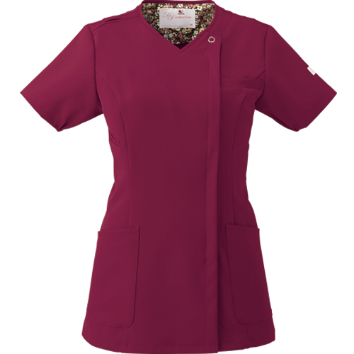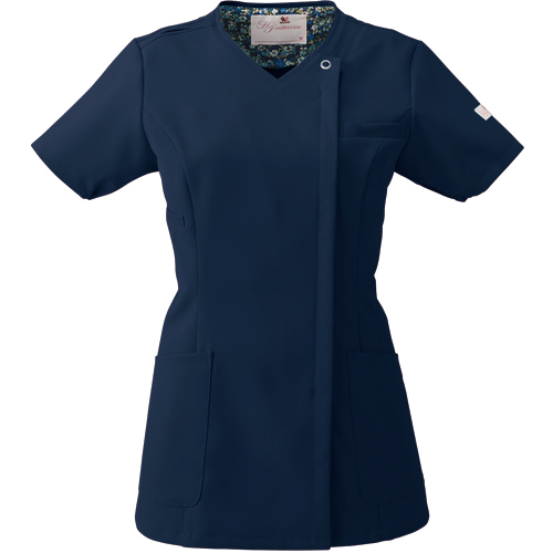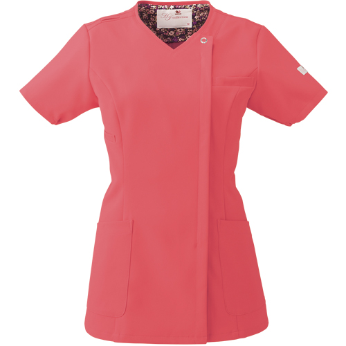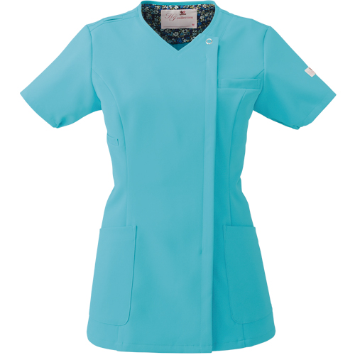 便利なループ付きの右腰のポケットは、サージカルテープやはさみなど小物類の収納に。左腰にもポケット付き。 フェミニンな花柄裏地