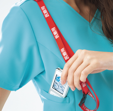 便利なループ付きの右腰のポケットは、サージカルテープやはさみなど小物類の収納に。左腰にもポケット付き。 フェミニンな花柄裏地