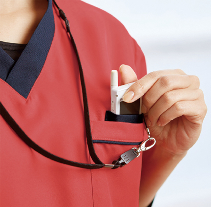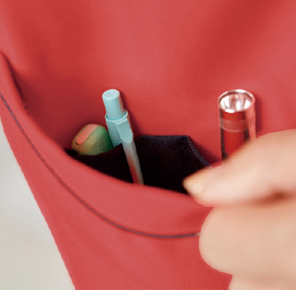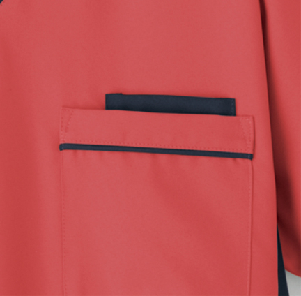 首にストラップが直接当たらない衿デザイン。胸ポケットはPHS収納に◎なダブル仕様。